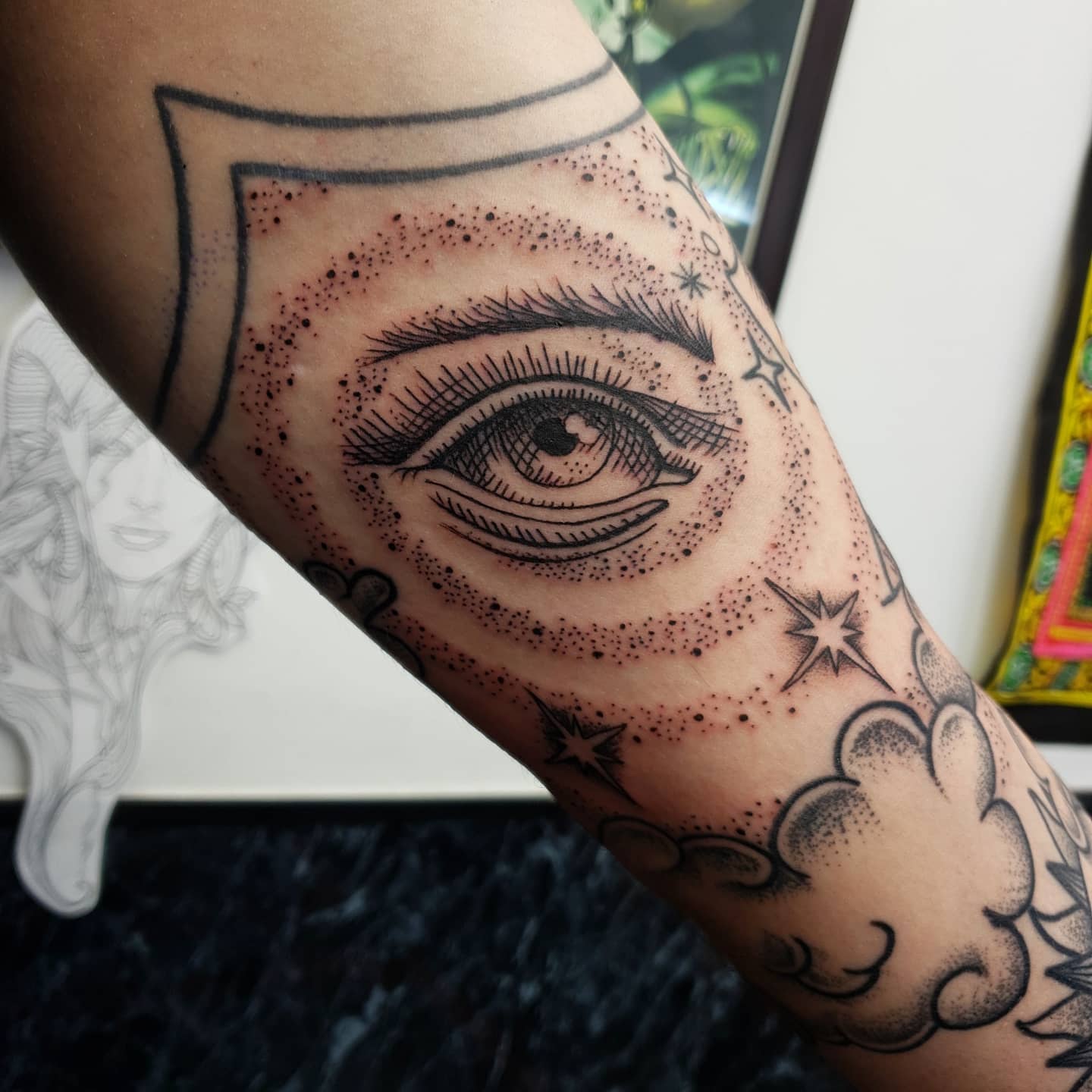 Added this cosmic eye overlooking the sky to Scott's beautifully healed project a few weeks ago- thanks again mate had a blast on this!!! Would love to do more in this style done @studioxiiigallery