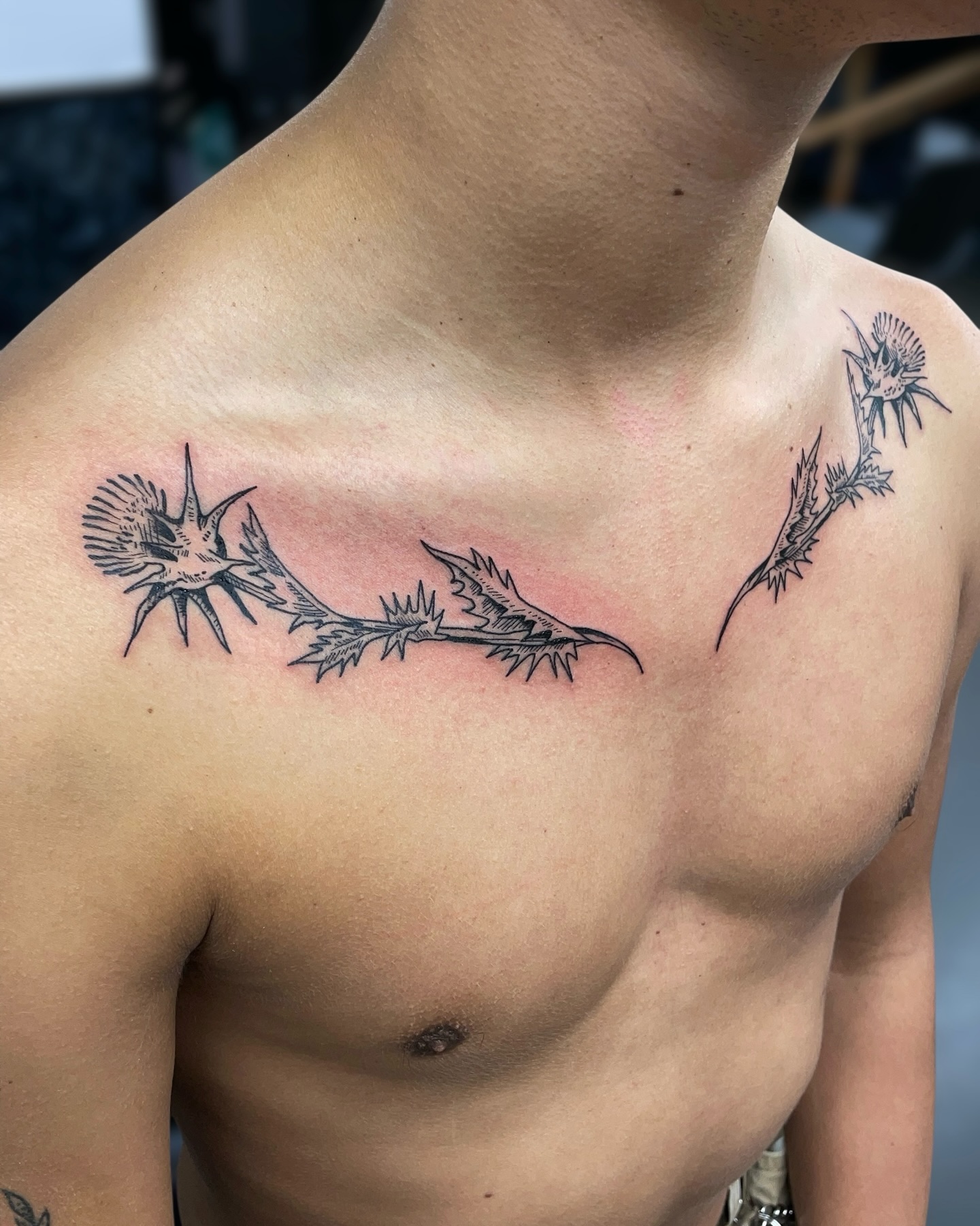 A pair of thistles on his chest, thanks Evan!🔥 Taking bookings now, DM your ideas or choose from flash in highlights✨ . . . Petra BaburkovaNovember 20, 2025Petra-C