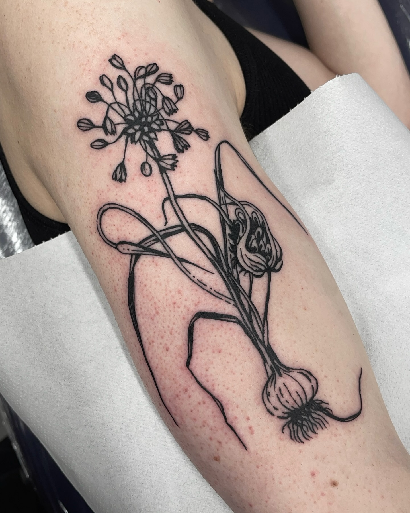 Garlic plant for Coinneach😁 thanks a lot! also my favourite plant forever💖 Books open now, DM for tattoos. . . . Petra BaburkovaDecember 2, 2025Petra-C