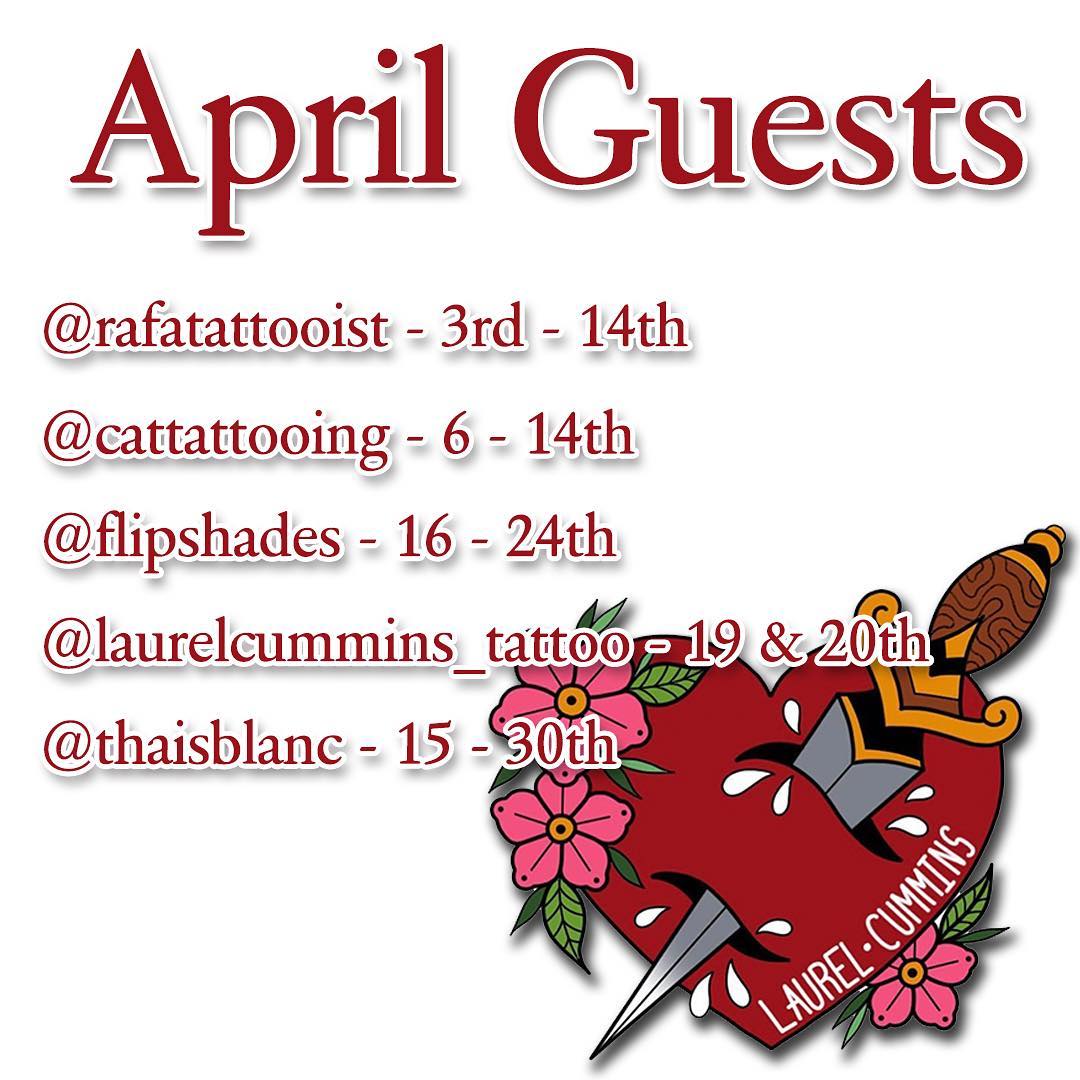 Pretty sweet update of April’s guests with @rafatattooist @cattattooing @flipshades @laurelcummins_tattoo and @thaisblanc all coming to play! Come play with us!