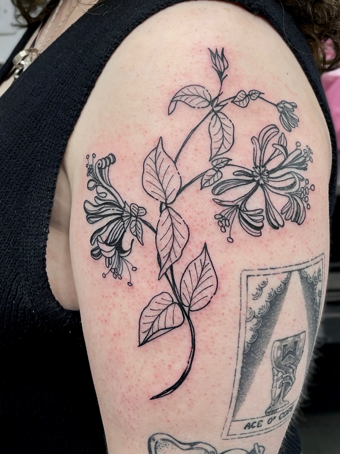 A honeysuckle plant tattoo for lovely Agathe😊 thanks a lot! For bookings DM. . . . blackwork lineart linetattoo floral botanical tattoo for women flash design woodcut linocut feminine artist tattooideas Petra BaburkovaJanuary 26, 2026Petra-C